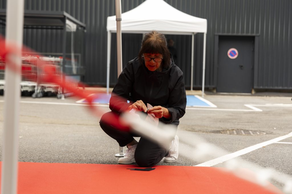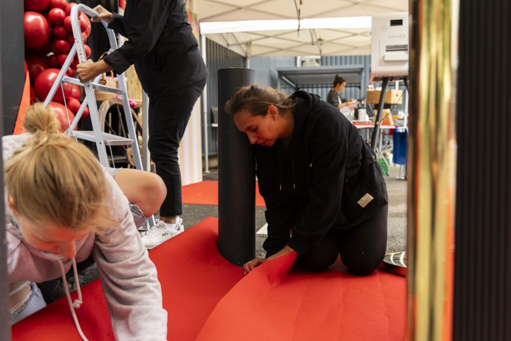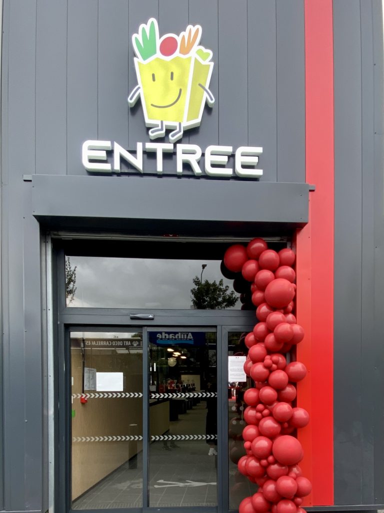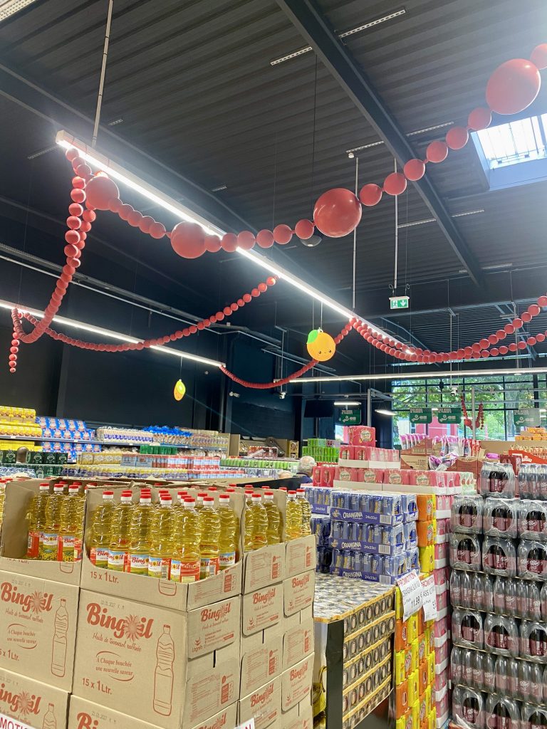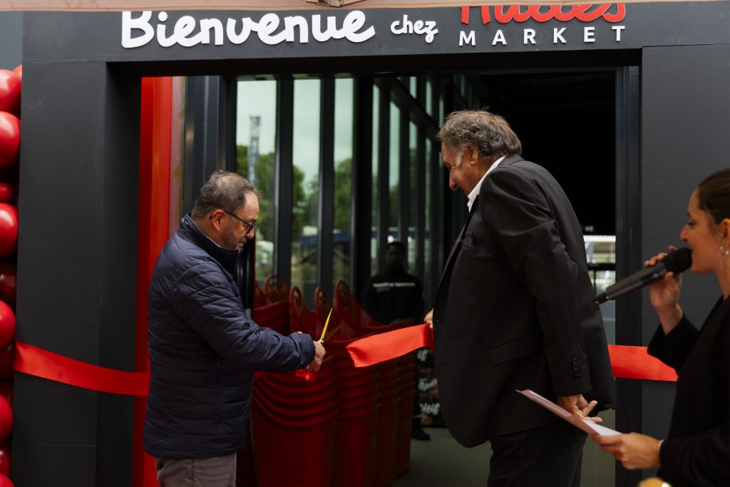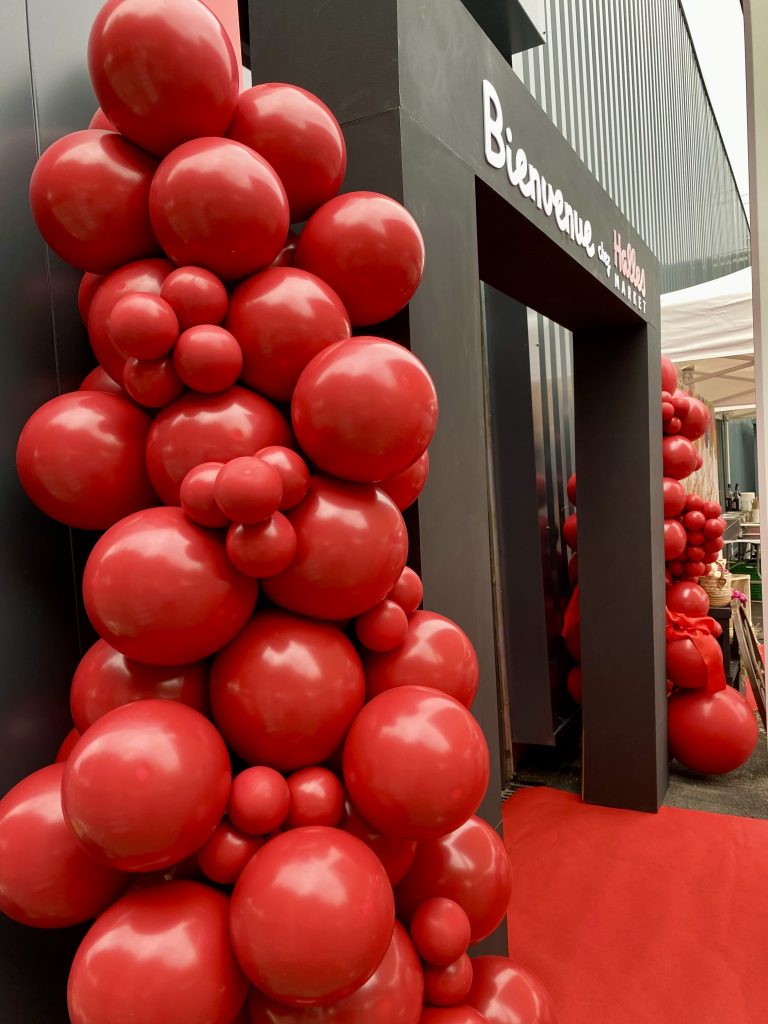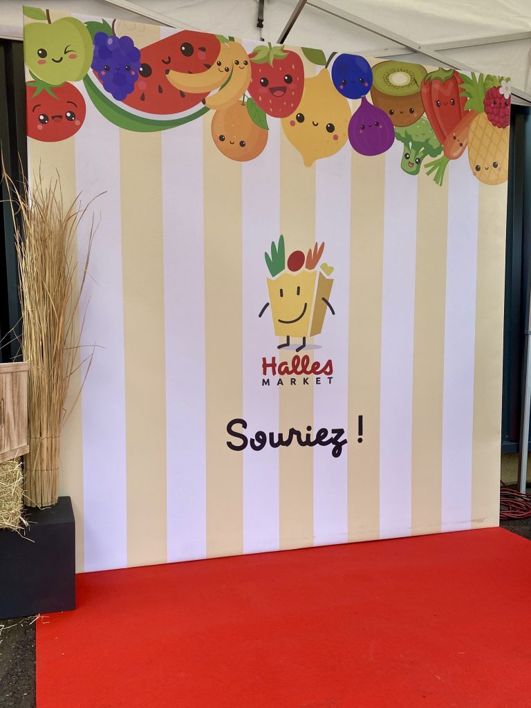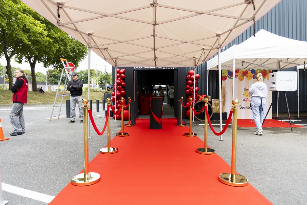 Pour marquer cet événement important, j’ai imaginé un décor événementiel à l’image de l’énergie de Halles Market : festif, accueillant et cohérent avec l’identité visuelle de la marque, notamment avec une dominante de rouge, clin d’œil aux codes couleurs de l’enseigne.