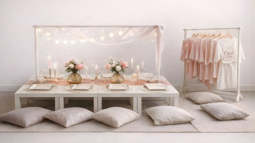 Une jolie table basse soigneusement dressée, des coussins confortables, une décoration harmonieuse, des fleurs délicates et une atmosphère chaleureuse où chaque détail est pensé pour faire plaisir.